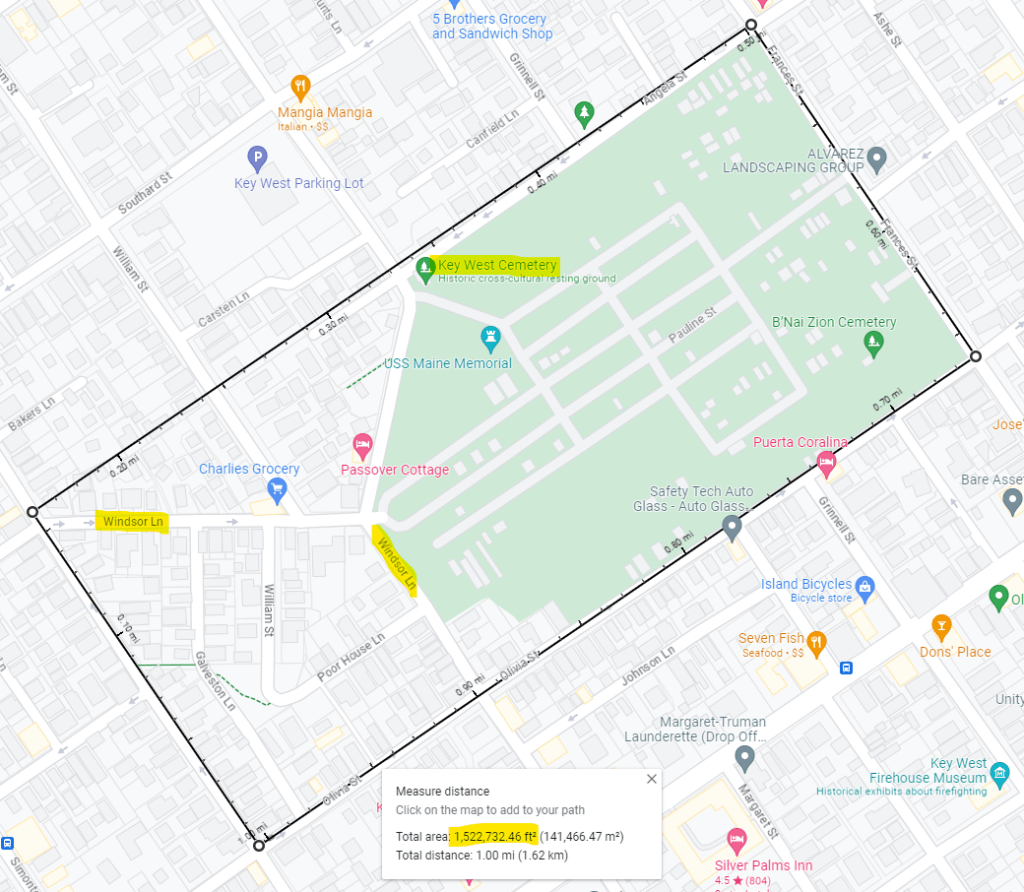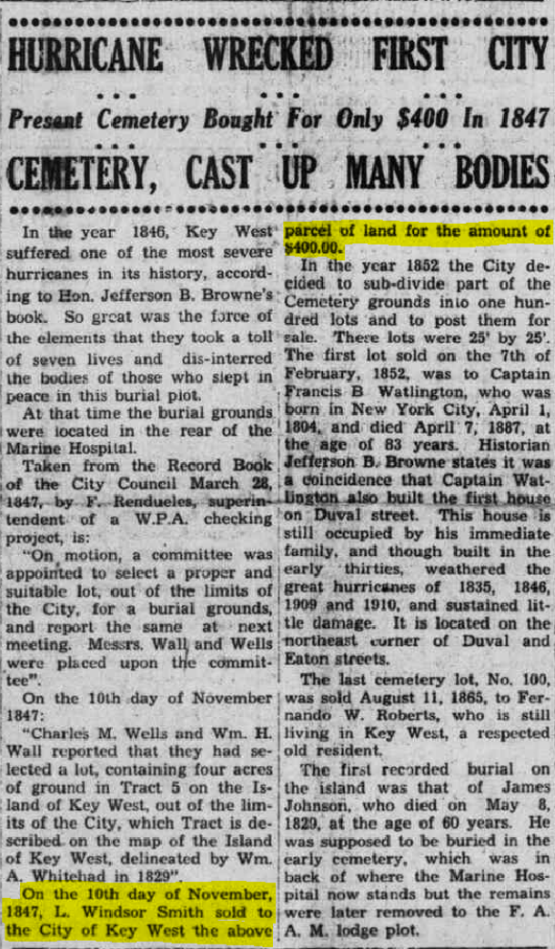 I’m not sure of the specifics of the real estate transaction, but apparently at some point in 1847 Larned purchased 35 acres of land bordering “Old Town” (now known as the Key West Historic District). On November 3rd, 1847 Larned was once again appointed to U.S. District Attorney. One week later on November 10th, 1847 he sells some or all of his recently acquired 35 acres to the City of Key West for $400 so a new cemetery can be established. The street bordering the cemetery on the Southwest side still bears his name: Windsor Lane.