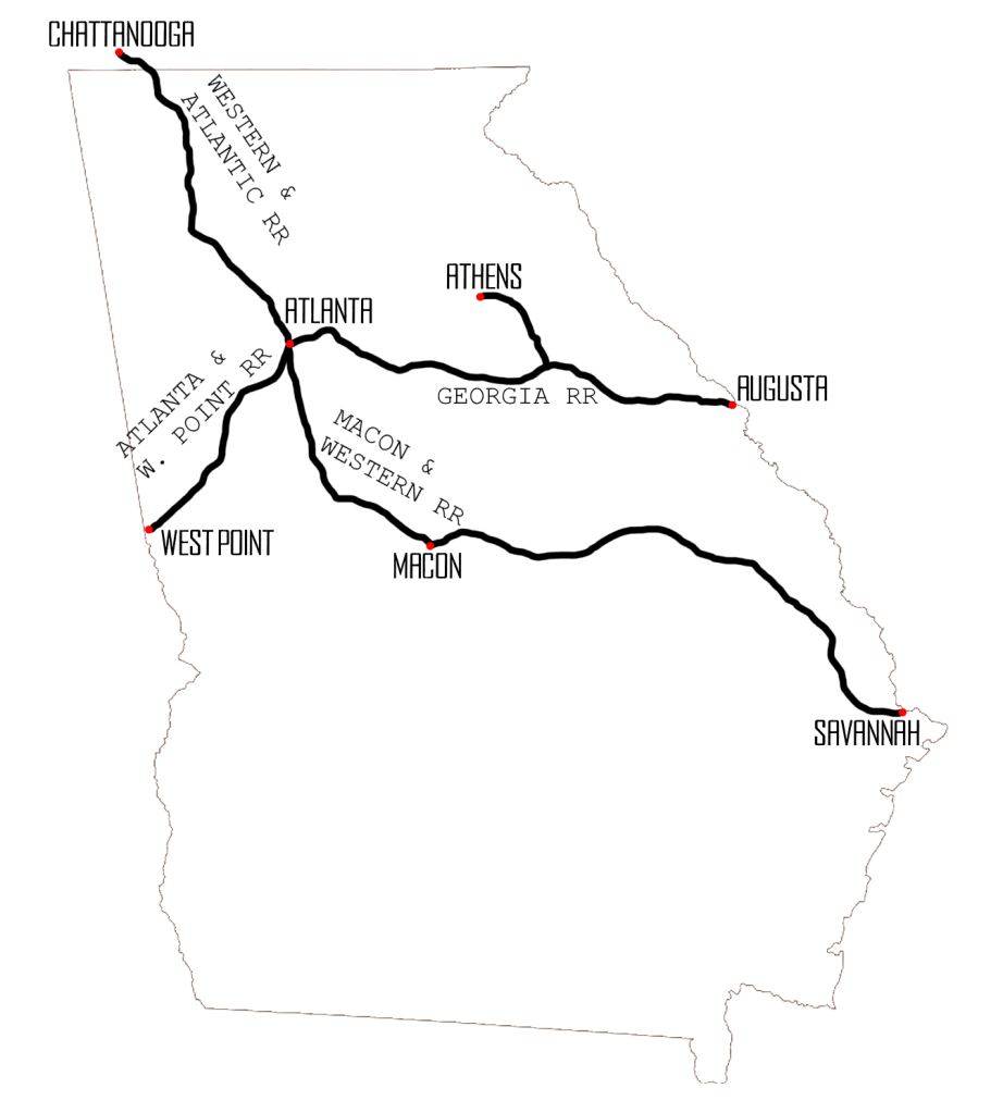 - ~1845 – The 171 mile Augusta-Terminus (Atlanta) connection of the Georgia Railroad is in operation.
