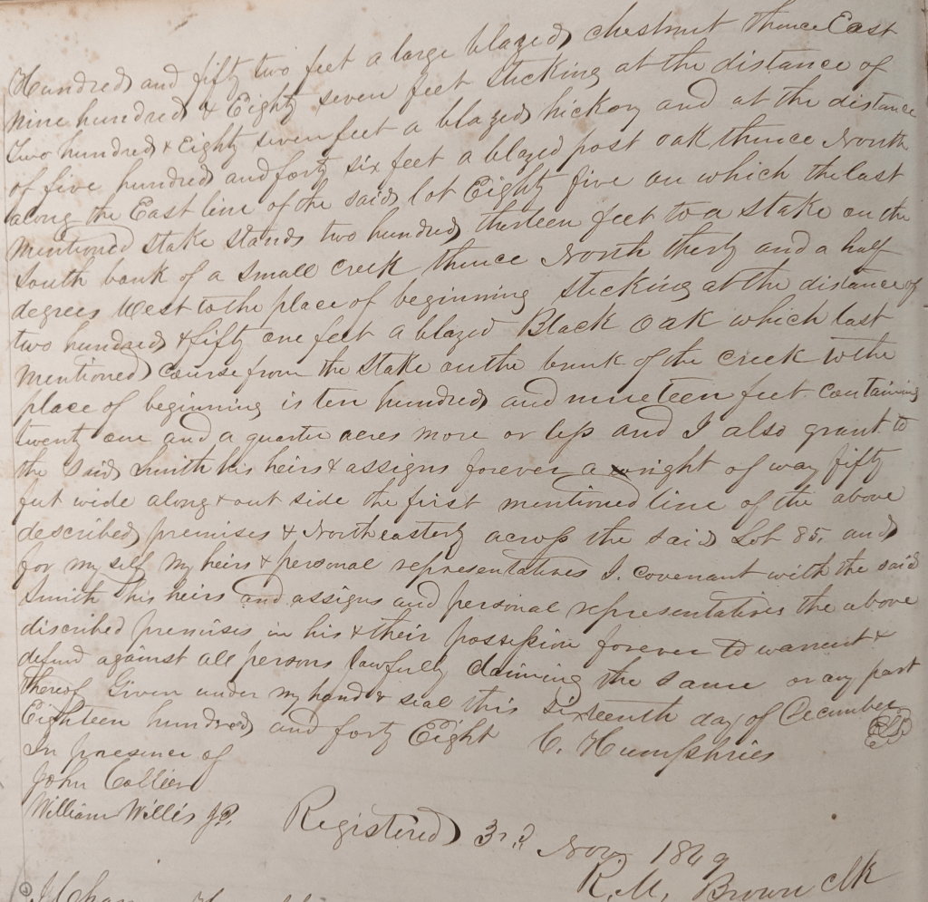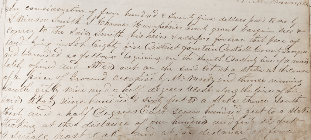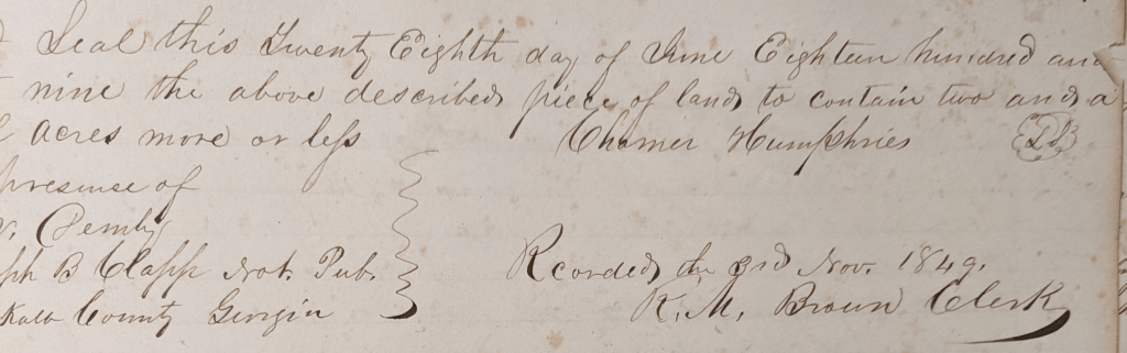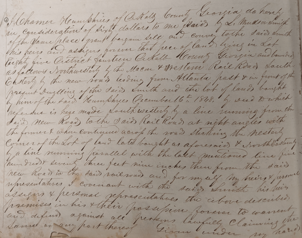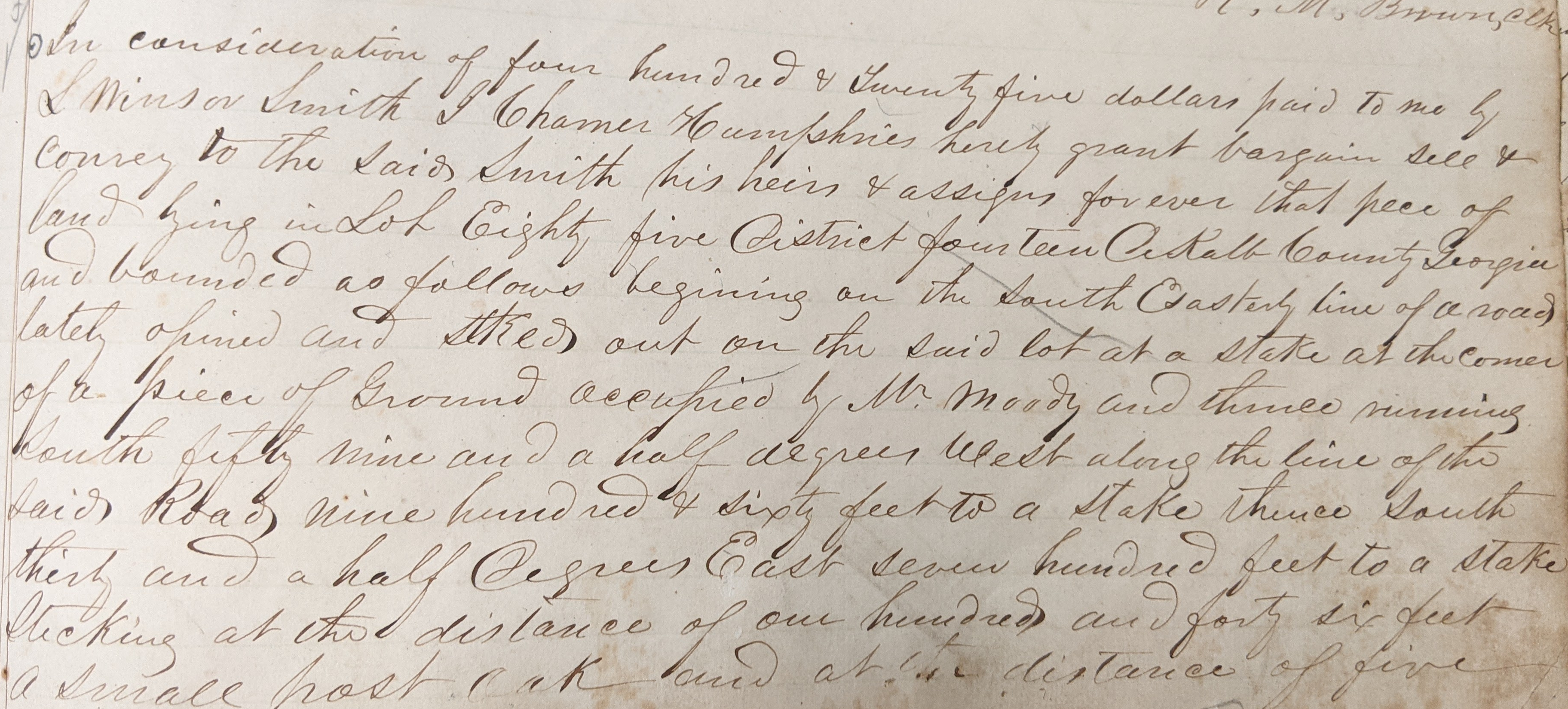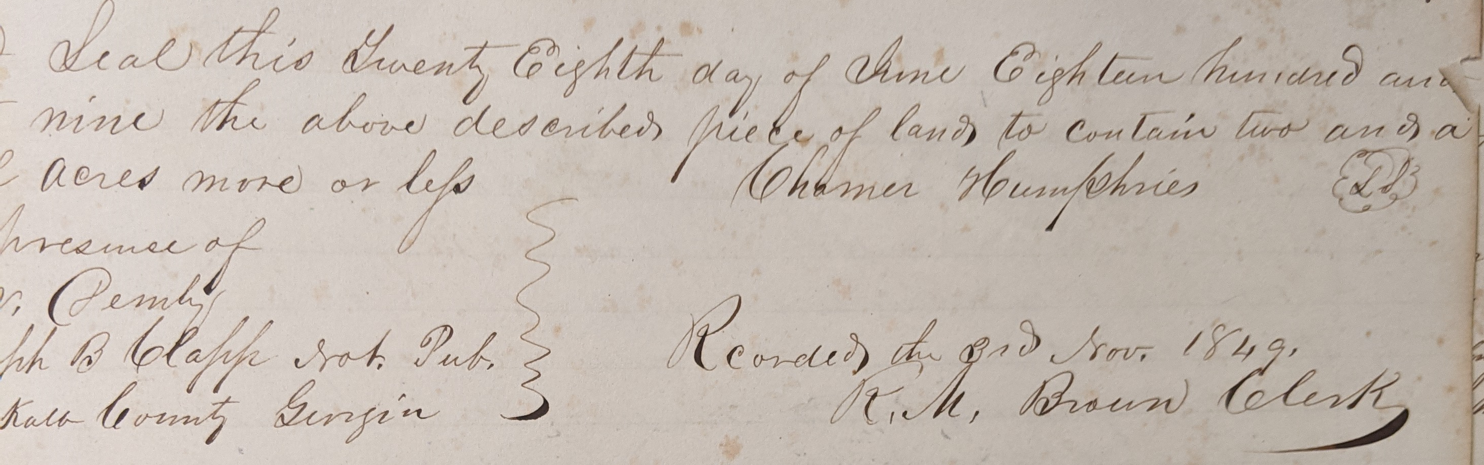 On 12/16/1848 Robert Windsor Smith’s father acquired 21 1/4 acres from Charner Humphries, the owner of the White Hall tavern. Here are images of the recording of the DeKalb County deed, and following I will include my attempt to transcribe the text.