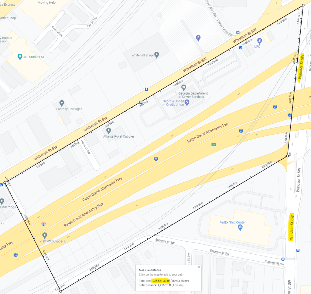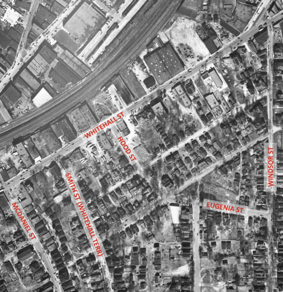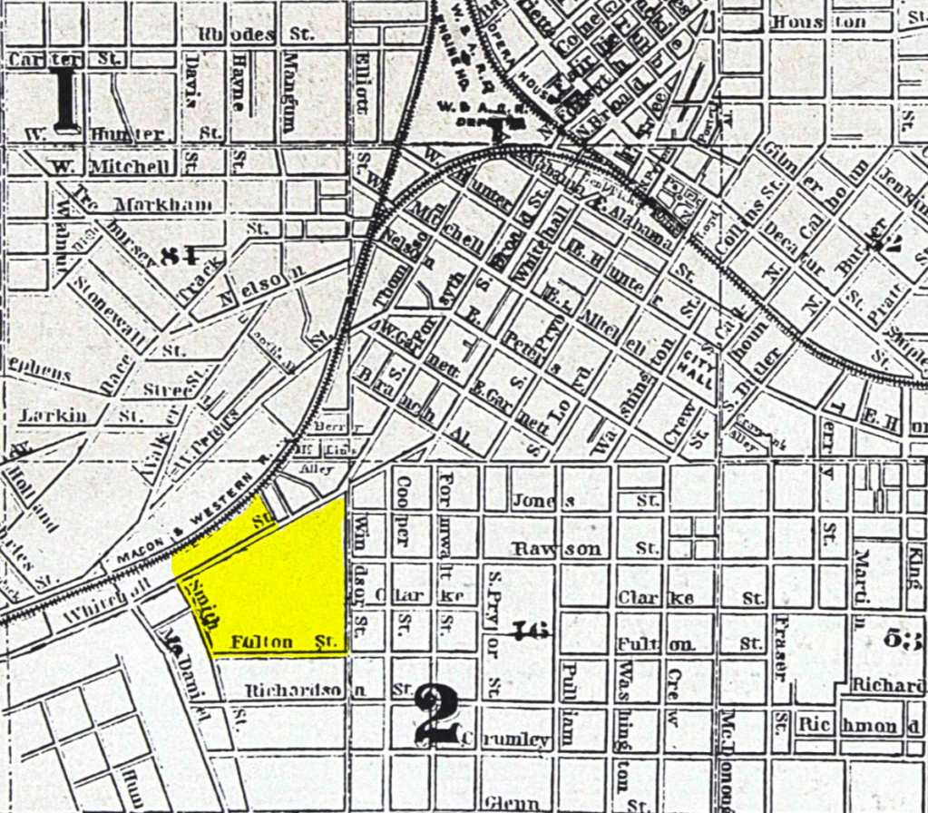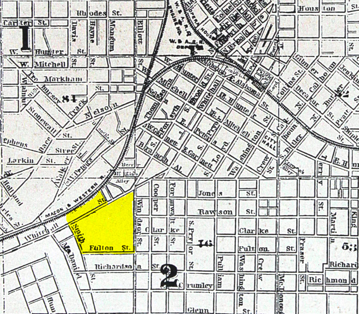 The property is now bisected by I-20. I believe the north section is considered to be part of the Castleberry Hill neighborhood and the south is in Mechanicsville. Click here to view the area in Google maps. This 1949 aerial photo shows the area prior to construction of I-20.