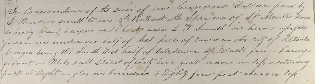On July 14, 1851 Larned purchases a storefront property on Whitehall Street in downtown Atlanta from one Robert M. Spencer. This section of Whitehall is now Peachtree Street, and the property is on the block between contemporary Martin Luther King Jr. Dr. SW and Alabama St. SW. Robert M. Spencer was the brother of Larned’s wife (Eveline Spencer Smith), who at the time was living in St. Marks, Florida. I do not know when or why Robert Spencer acquired the Whitehall property.