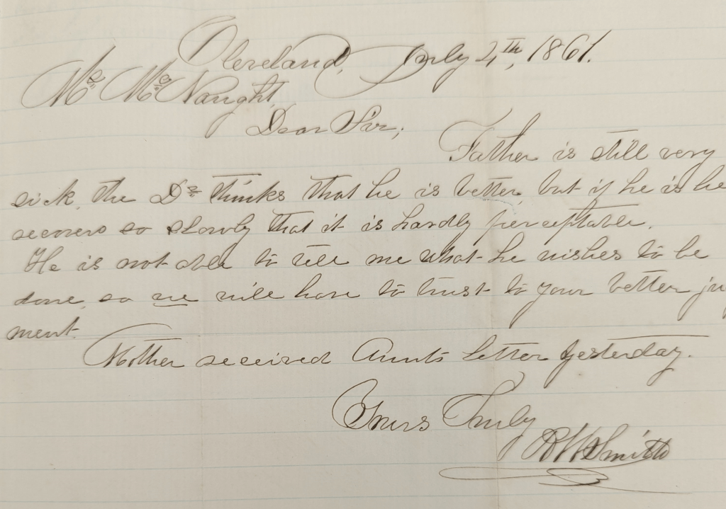 Whatever the reason for the move, it proved to be literally short-lived for Larned. On July 4, 1861 Robert Windsor Smith writes the following letter to his uncle in Atlanta William McNaught (more on him later):