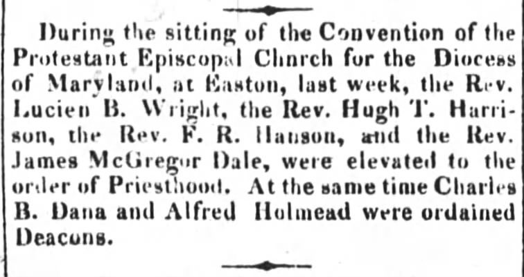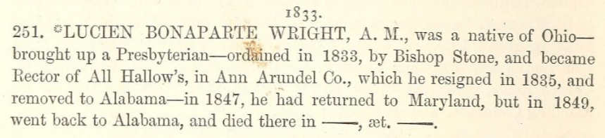 So we may not know definitively where Rev. Wright was born, but we do know that he graduated from St. John’s College in Annapolis, Maryland in 1834. He was also ordained as a priest in the Protestant Episcopal Church in June 1834.