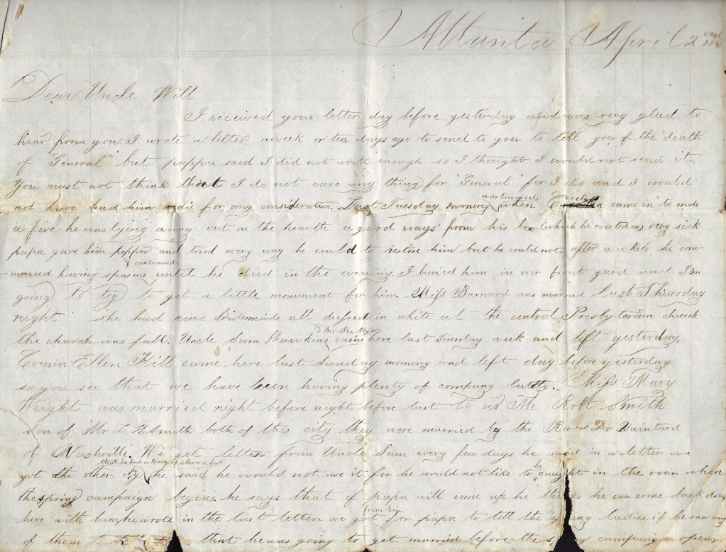A letter dated April 2, 1864 written by 11 year old Willie Fort Williams to his uncle includes the following: