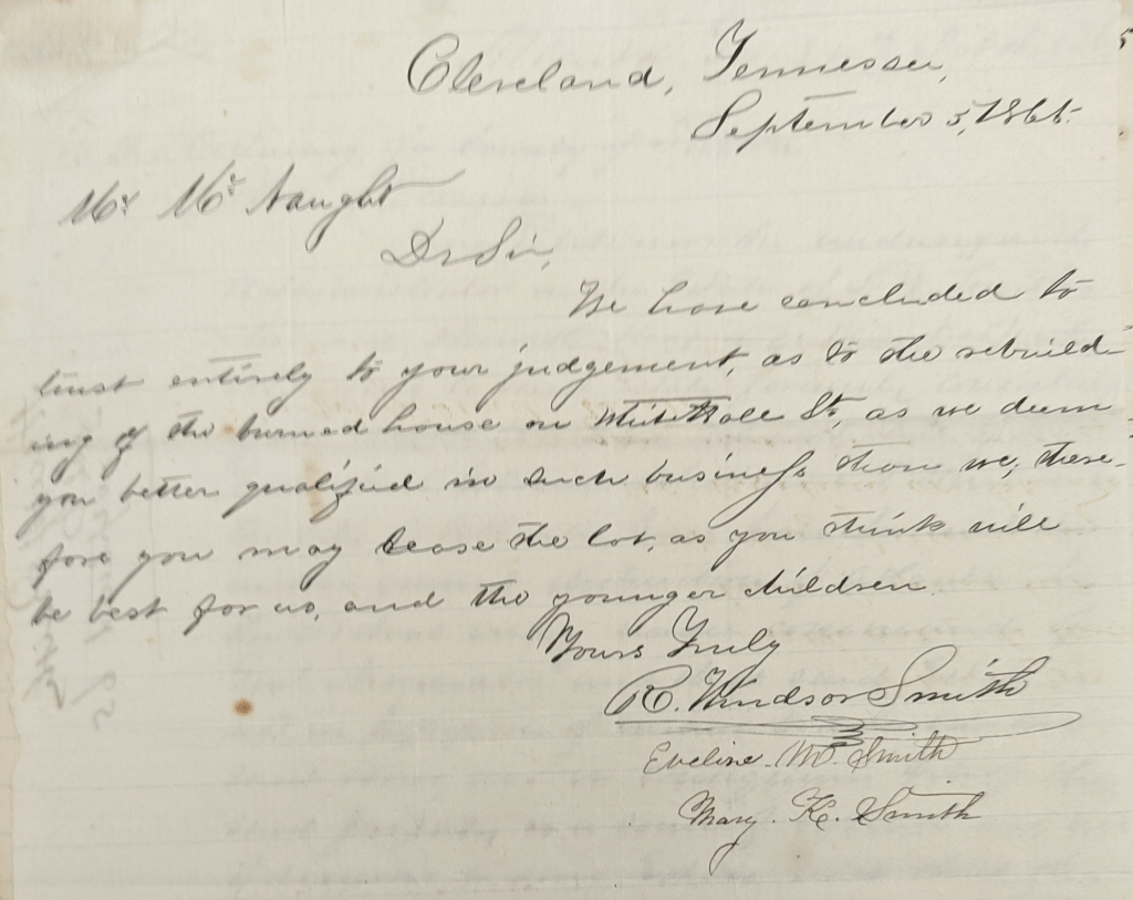 I’m not aware of the exact circumstances of the Smith family living in Cleveland, TN immediately after the war, nor do I know the whereabouts of Robert’s new bride Mary Cleveland Wright Smith at this time. By September 1865, we do know that Robert Windsor Smith had made his way back to Cleveland, TN. The following letter from Robert, his mother Eveline, and his eldest sister Mary to William McNaught is in the McNaught papers at the Atlanta History Center.
