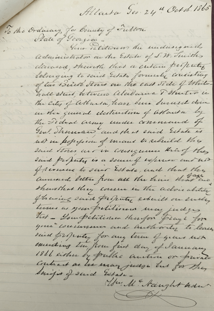 Your petitioner, the undersigned administrator of the Estate of L. W. Smith, deceased, (?) that a certain property belonging to said Estate formerly consisting of two brick stores on the east side of Whitehall Street, between Alabama & Hunter in the City of Atlanta, have been burned down in the general destruction of Atlanta by the Federal Army under command of Gen. Sherman and that said Estate is not in possession of means to rebuild the said stores, and in consequence (?) if the said property is a source of expense and not of services to said Estate, and that the (?) letter from all the heirs of age and (?) they concur in the advisability of having said property rebuilt on (?) terms as your petitioner may judge.