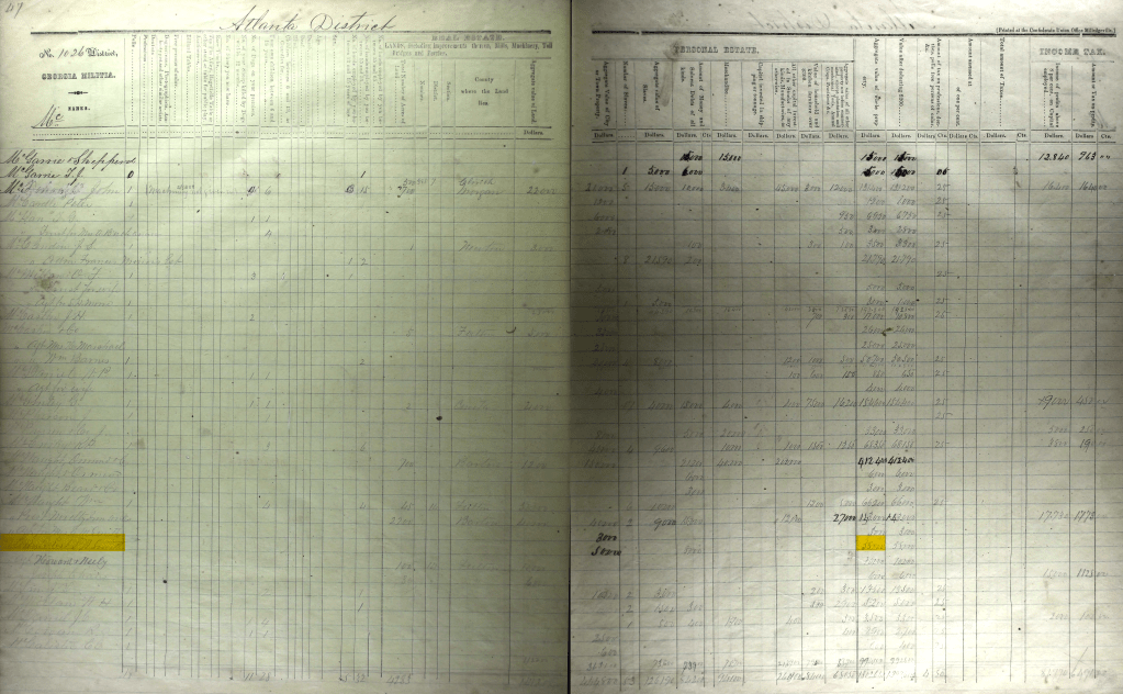 So we know that the considerable L. W. Smith estate in Atlanta (administered by Robert’s uncle William McNaught) had suffered considerable losses, as I imagine did all property owners in Atlanta. The 1864 Atlanta tax digest lists the aggregate value of the L. W. Smith estate at $58,000. The stated amount is clearly in Confederate dollars.