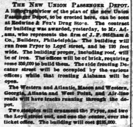 In order for Atlanta to live up to its “Gate City” moniker a new depot was to be constructed on the site of a former park on land owned by the Mitchell heirs. Construction began sometime in mid-1870 and while it was expected to be completed by October, 1870, construction continued well into mid-1871.