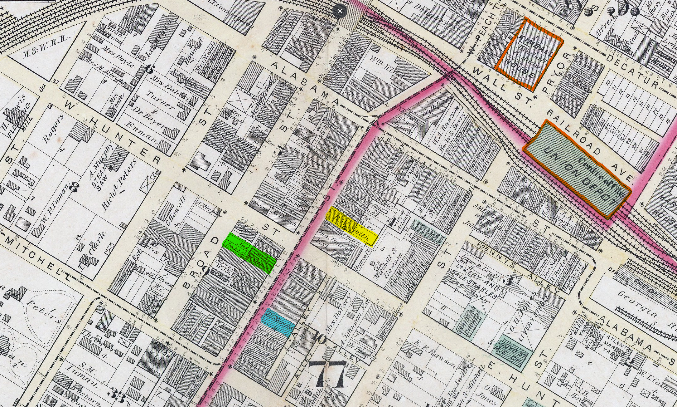 Note the Kimball House and Union Depot outlined in orange at the top right. The Smith estate storefronts are highlighted in yellow at 54 & 56 Whitehall. The 69 & 71 Whitehall storefronts are highlighted in green, they are the property in question in the GA Supreme Court case of Scofield v. McNaught. Finally, the property highlighted in blue is 86 & 88 Whitehall, owned by McNaught.