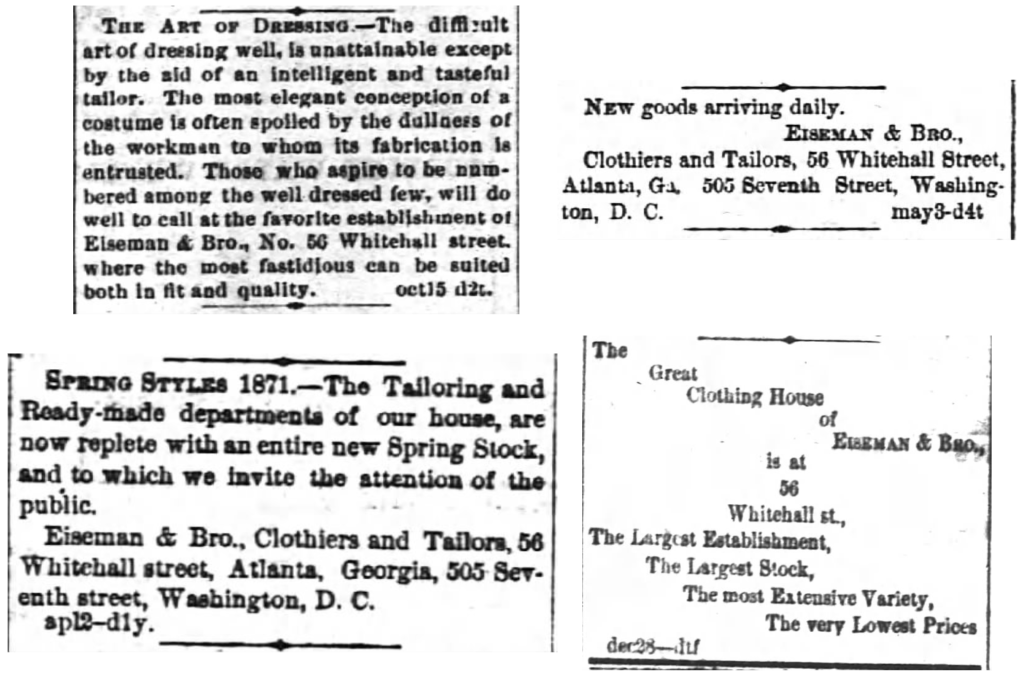 The 1867 V. T. Barnwell Atlanta city directory includes a listing for the Eiseman & Bro. store, so they may have actually been operating in the newly rebuilt storefront as early as 1867. The physical location of “east side of Whitehall, near Hunter” certainly lines up.