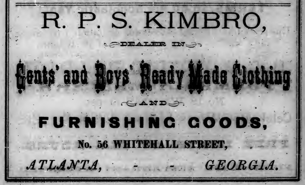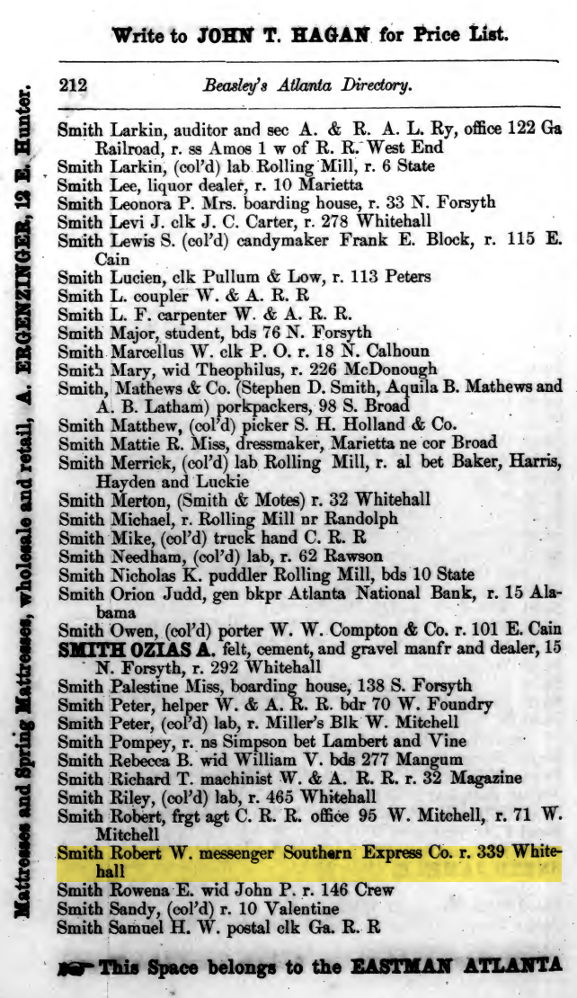 The 1874 Beasley’s Atlanta Directory is the first evidence I could find indicating an actual residential house number for Robert Windsor Smith and his family. As discussed in a previous post, the residence is listed as 339 Whitehall (renumbered to 385 in 1892), and the Smith family would live there until their move to Kirkwood sometime in 1890.