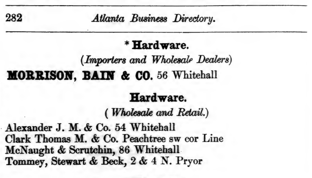 | Alexander J. M. & Co. (Julius M. and Aaron Alexander) hardware whol. and ret. 54 Whitehall | MORRISON, BAIN & CO. (John Morrison, Donald M. Bain, and Angus Morrison) hardware importers and whol dealers, 56 Whitehall |