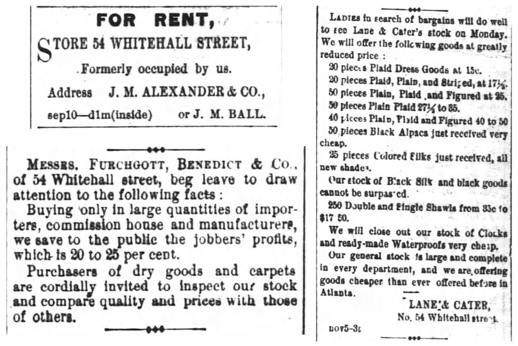 Additional retail tenants at 54 & 56 Whitehall between 1874 and 1877 include Furchgott, Benedict & Co., W. E. Cater, Lane & Cater, and R. P. S. Kimbro.