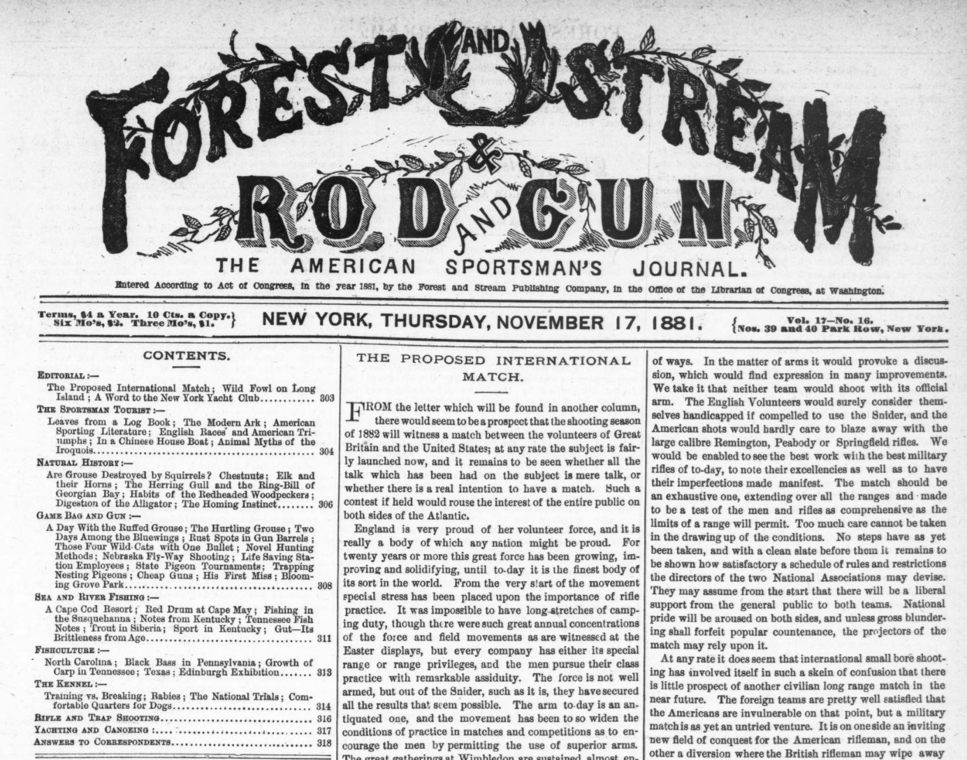 A brief note today, about what may initially seem like an inconsequential fact. During the years 1881-1887, I was able to find mentions of Robert Windsor Smith owning, showing, and breeding a mastiff named Turk II. While the details of Robert’s activities with his dog is somewhat interesting, it may be ultimately more important that it establishes his readership of Forest and Stream magazine during George Bird Grinnell‘s editorship. I’ll discuss George Bird Grinnell and his establishment of the first Audubon Society in the pages of Forest and Stream in a future post. To give an idea of what the contents of a typical Forest and Stream issue included, see the contents listed on the following title page.