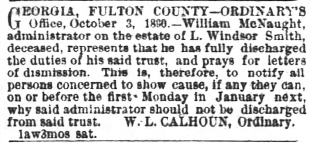 In October of 1890 Robert’s uncle William McNaught discharged his duties as administrator of the L. Windsor Smith estate. McNaught had served in this capacity for nearly 30 years following the death of Robert’s father in 1861.