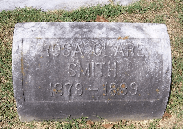 The uncertainty about the actual number of Smith family members in late 1889 is due to the unfortunate demise of Rosa Clare Smith. Robert and Mary’s daughter Rosa was born in 1879, but sadly passed away at an unknown date in 1889 at the age of 9 or 10. Her cause of death is also unknown, but this must have been a terrible tragedy for the family. Mary had given birth to nine children, and now only four were still living: Eugene, Evie, Spencer, and Earnest.