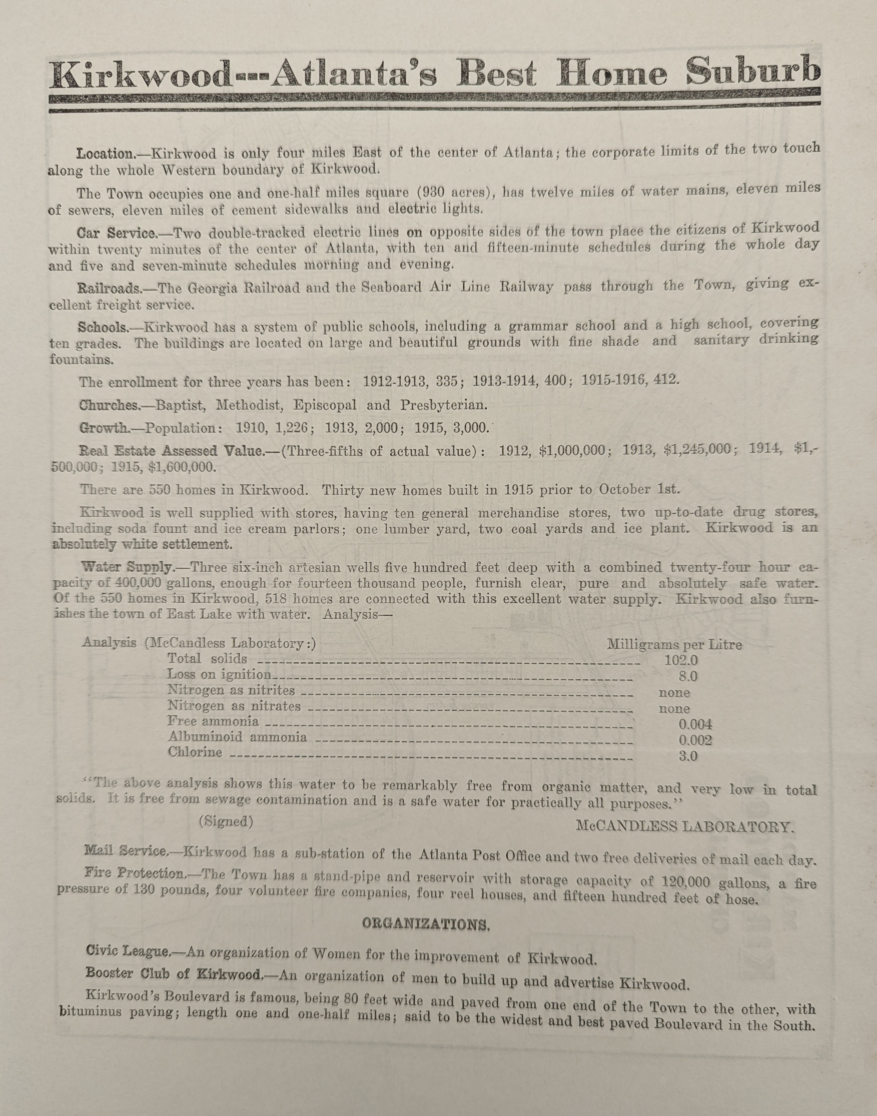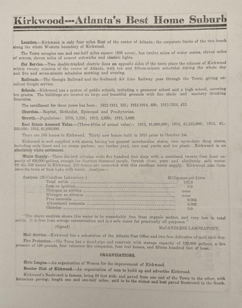 The fact that the 1916 flyer boasts Kirkwood’s “absolutely white” population as worthy of inclusion in an advertisement is not surprising given the state of Jim Crow-era Atlanta at this time. As someone who has invested an inordinate amount of time poring over Atlanta area newspapers from around this period, disturbing patterns emerge, specifically that of the repeated claims of “the ravishing of white women by black brutes.” Thomas Dixon Jr.’s The Clansman (which included the fictional rape of a 15 year-old white girl by a former slave) is probably to blame for much of this, and the 1906 Atlanta race massacre was sparked by newspaper articles alleging four attacks on white women.