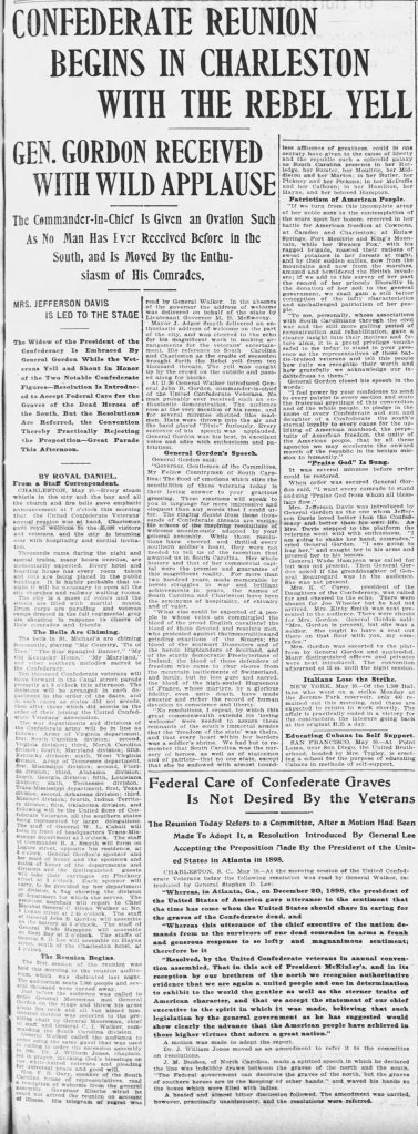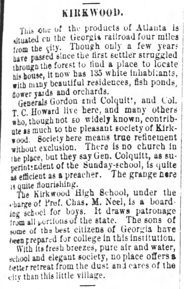 While the article above paints a bucolic portrait of this “little village,” it’s important to keep in mind that the political tactics of many of the prominent “redeemer” citizens of Kirkwood mentioned above were undeniably racist. They undoubtedly benefited from convict lease programs, legislative measures like the poll tax intended to deliberately disenfranchise (male) black voters, the Klan’s intimidation through violence, and the enshrinement of the Confederate “Lost Cause” mythos. John B. Gordon, in particular, seems to have embodied this nostalgia for the Confederacy as we can see in this 1899 article about a visit he made to Charleston, S. C. for a Confederate “reunion.”