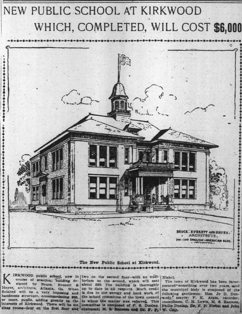 Amongst the amenities listed on the 1916 advertisement for Kirkwood is a reference to Kirkwood’s schools. The first school was built in 1906, following the successful 1904 incorporation, and on September 10, 1906 104 (presumably all white) pupils were in attendance. We’ll come back to the school in a moment as well…