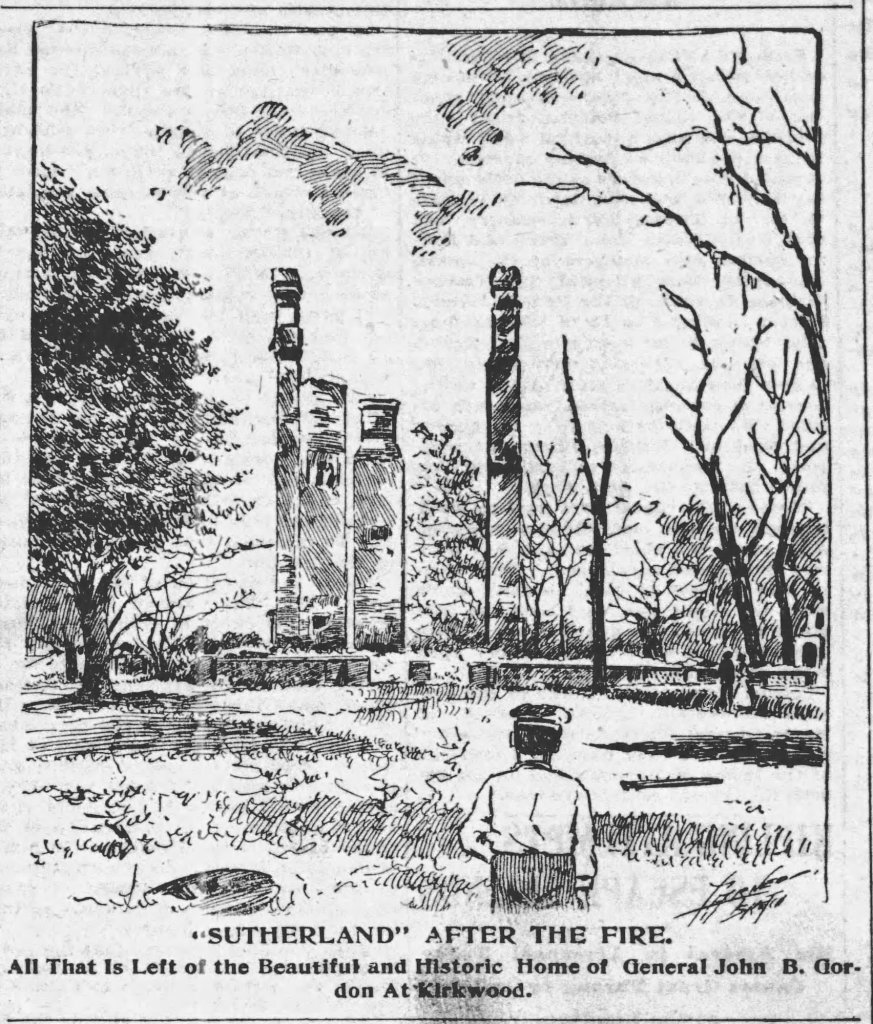 John B. Gordon’s “Sutherland” estate was not so lucky. The original Sutherland burned to the ground on Wednesday, June 21st 1899. Gordon himself was out of town, but family, friends, and neighbors (including Dr. Alfred F. Green) hurriedly removed as much of the contents of the home as possible to prevent them from being lost to the fire. Note, that the image of Sutherland presented in my previous post is the Greek Revival house built after the original had burned. That second iteration of Sutherland stood until sometime between 1938 and 1949 (photos exist from 1938, gone in 1949 aerial photography).