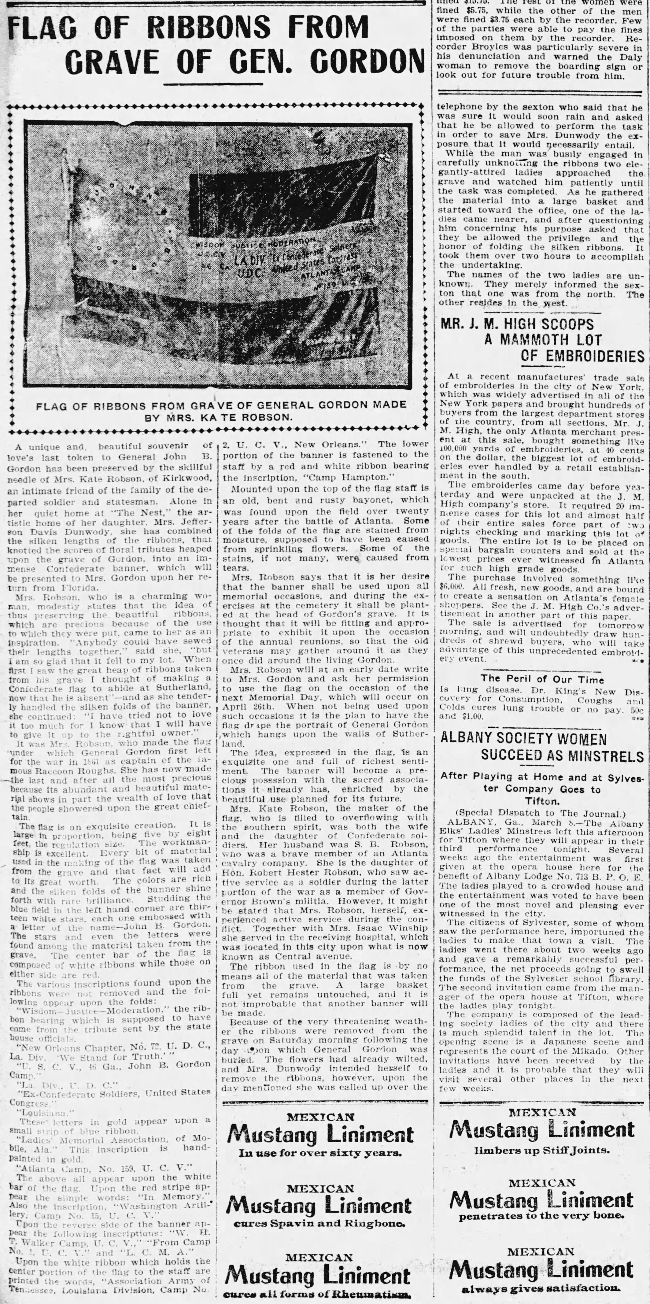 Prior to the installation of the Gordon statue at the capitol, Mrs. Kate Robson (who you may recall from my last post is credited with giving Kirkwood its name) collected ribbons from Gordon’s gravesite and sewed them into a Confederate banner which was gifted to his widow. Interestingly, the March 8, 1904 article describing this mentions that Robson had also “made the flag under which General Gordon first left for the war in 1861 as captain of the infamous Raccoon Roughs.“