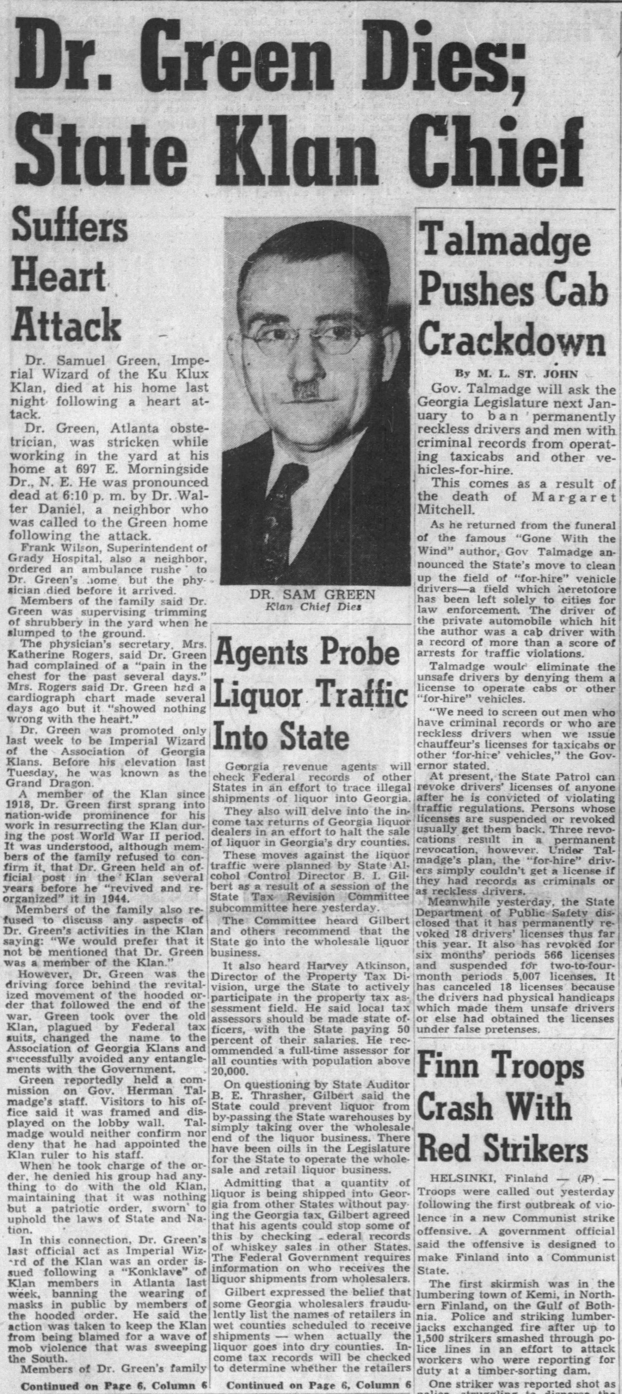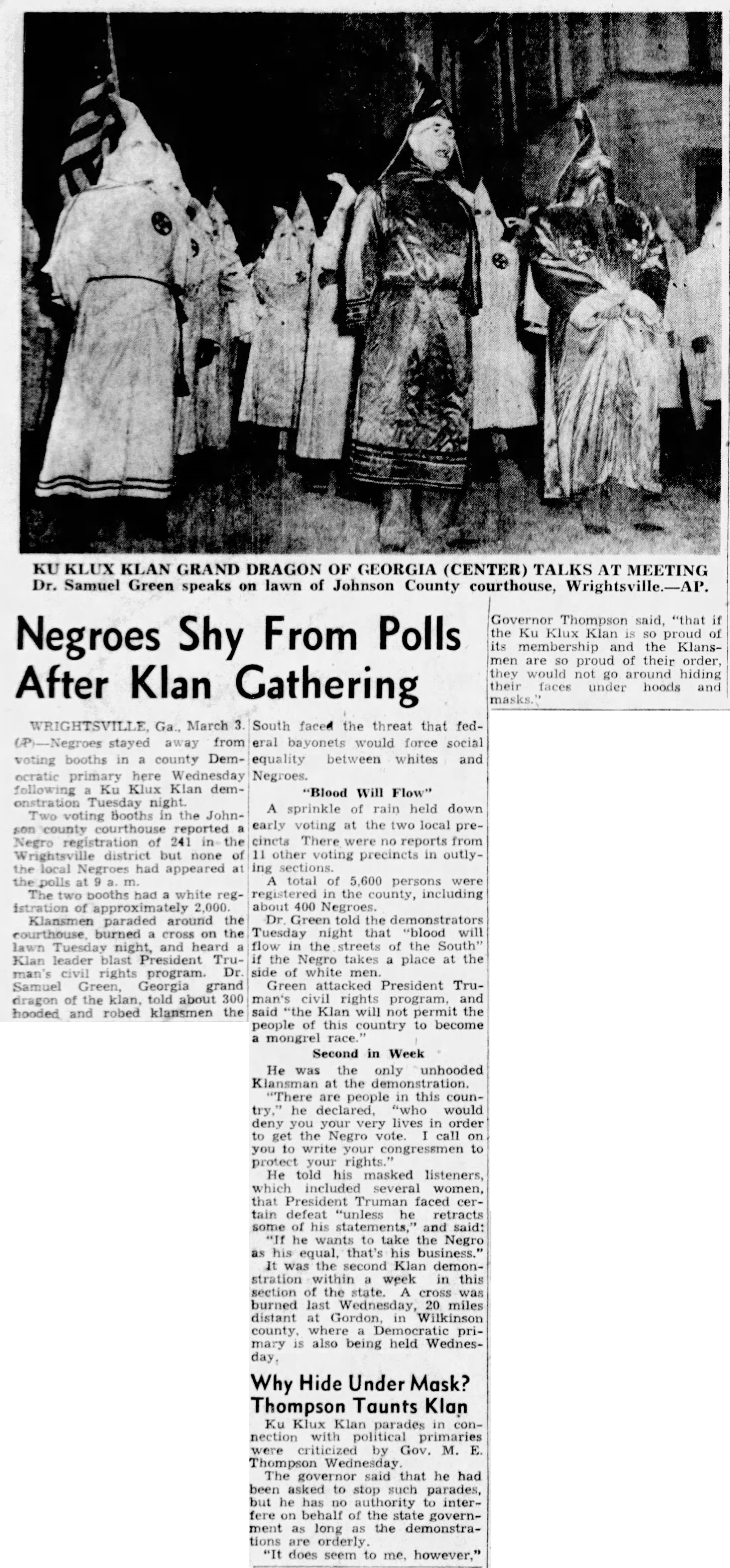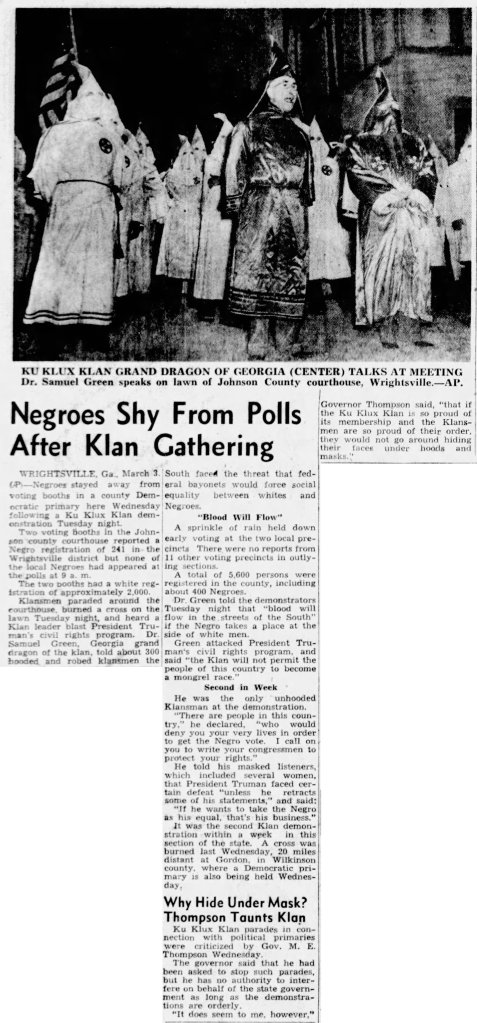 After World War II Green reformed the Klan at a ceremony atop Stone Mountain and eventually was named to the highest position of Imperial Wizard. Familiar tactics of voter suppression through the threat of violence were employed, as can be seen in this March 1948 article: