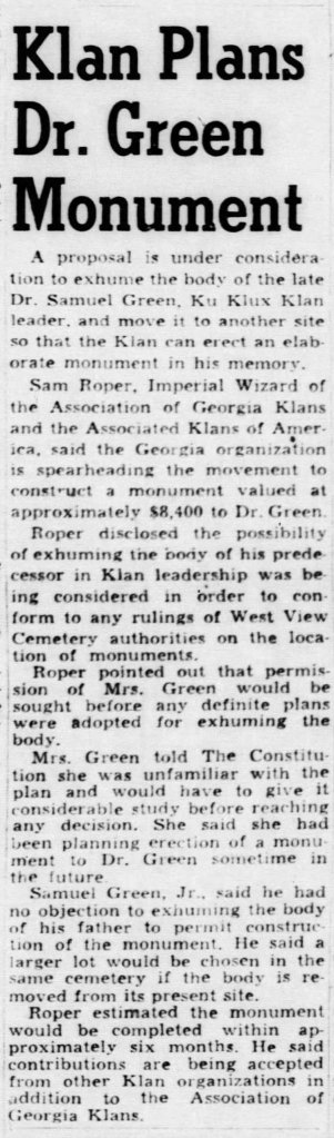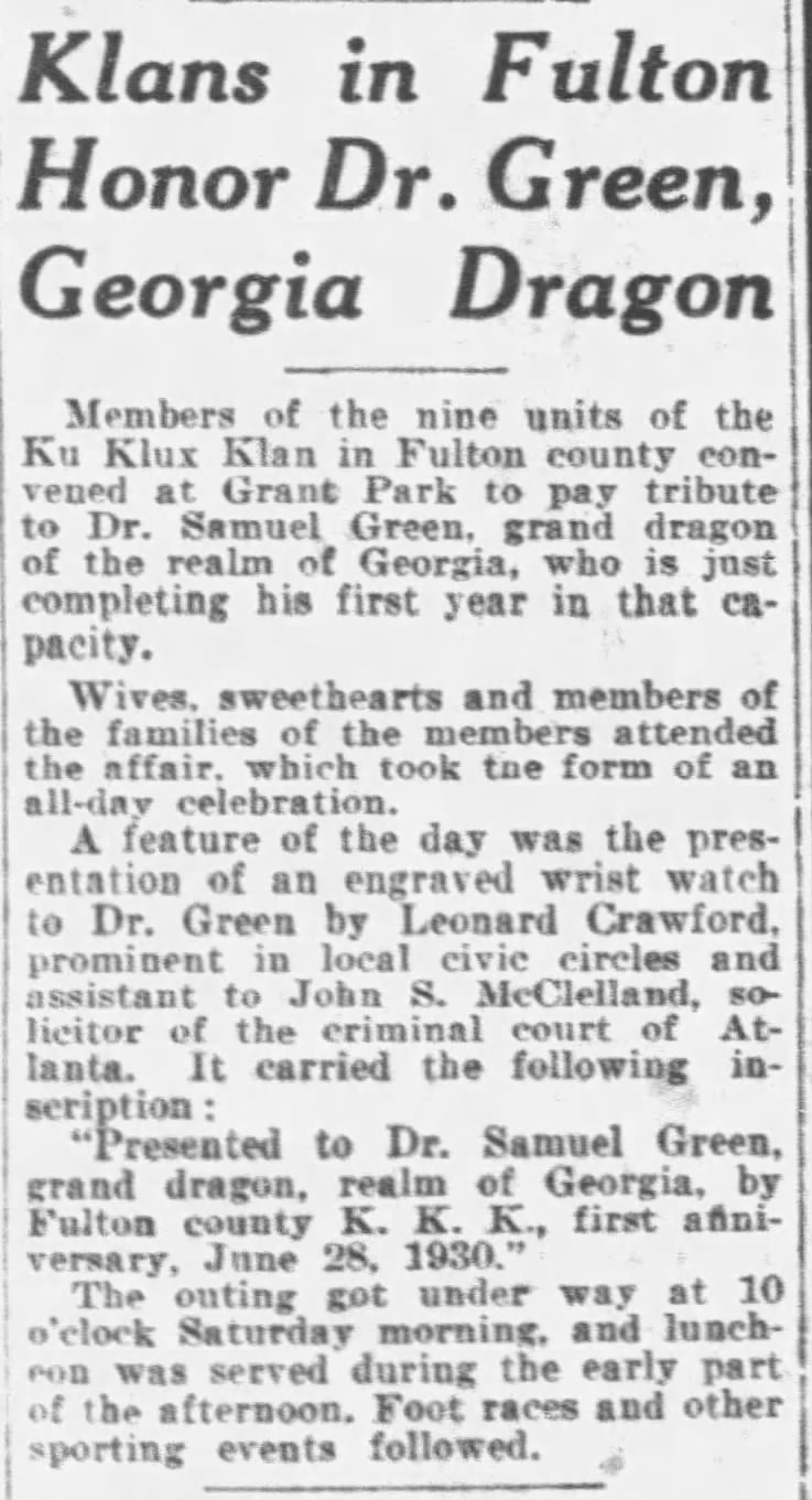 A widely publicized 1925 conviction of Klansman D. C. Stephenson and The Great depression led to a significant decline in Klan membership. Samuel Green was promoted to Grand Dragon of Georgia in 1929 following Nathan Bedford Forrest II‘s promotion to “Imperial Klokann.” As a celebration of his first anniversary of service as Grand Dragon of Georgia, Green was presented with an engraved watch.
