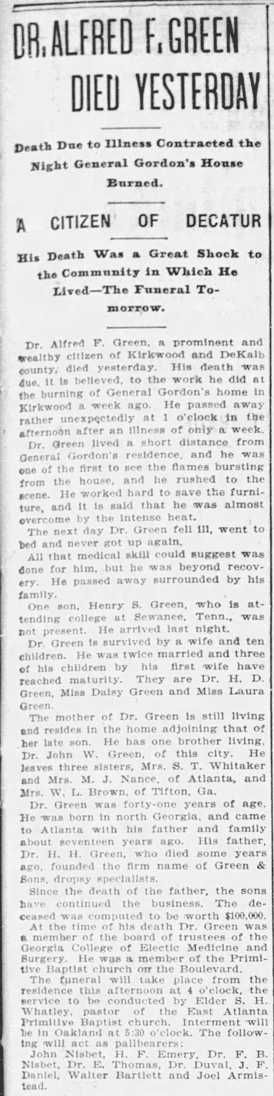 One of Gordon’s neighbors in Kirkwood was his acquaintance Dr. Alfred F. Green. Green had settled in Kirkwood sometime around 1889-1890, following his brother Elijah W. Green’s move there around 1887-1888. Alfred Green had married Miss Annie Kate Taylor (later remarried and commonly referred to as Kate Green-Hess) on Halloween in 1885, and once they arrived in Kirkwood built an expansive home on Howard Street just across the Georgia Railroad tracks from Gordon. The house still stands today, a stones throw from my own home.