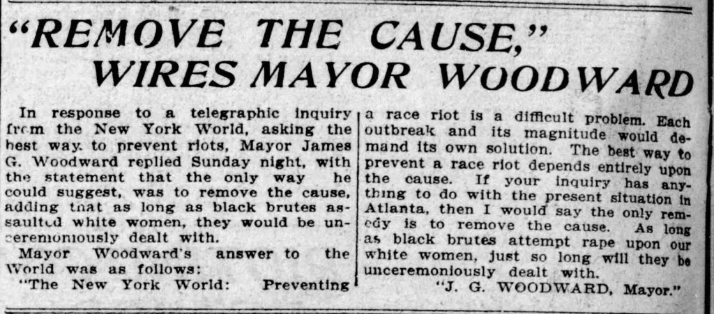 A little over a week later, D. W. Griffith’s The Birth of a Nation opens at the Atlanta Theater to great fanfare. While the film represents an important milestone in the history of cinema it is also (particularly in the second half) shamefully racist. Not only does the film reinforce the stereotype of the danger of “brutes” attacking and defiling white women, it props up the Ku Klux Klan as protectors and saviors that defended the south from reconstruction. A committee of local ministers had appealed to Mayor James Woodward months earlier to prevent the screening of the film in Atlanta out of concern that it “might stir up race prejudice.” It’s not difficult to understand why Woodward was disinclined to seriously consider their appeal when you realize that his response to the 1906 Atlanta race massacre (which took place during his earlier tenure as Mayor) was as follows:
