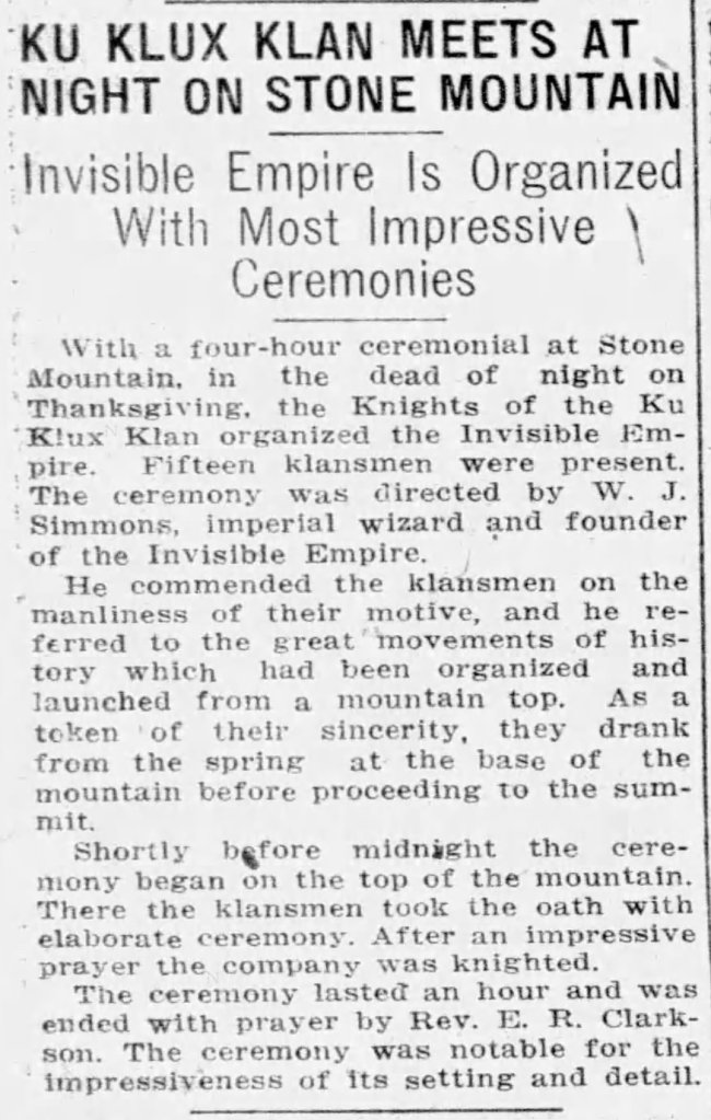 A small note appears in the legal notices section of the November 1, 1915 Atlanta Journal regarding formation of the Knights of the Ku Klux Klan, referred to as a “fraternal beneficiary society.” On the night of Thanksgiving, November 25, 1915, William Joseph Simmons holds a ceremony atop Stone Mountain where a cross is burned and the second iteration of the Ku Klux Klan is born.