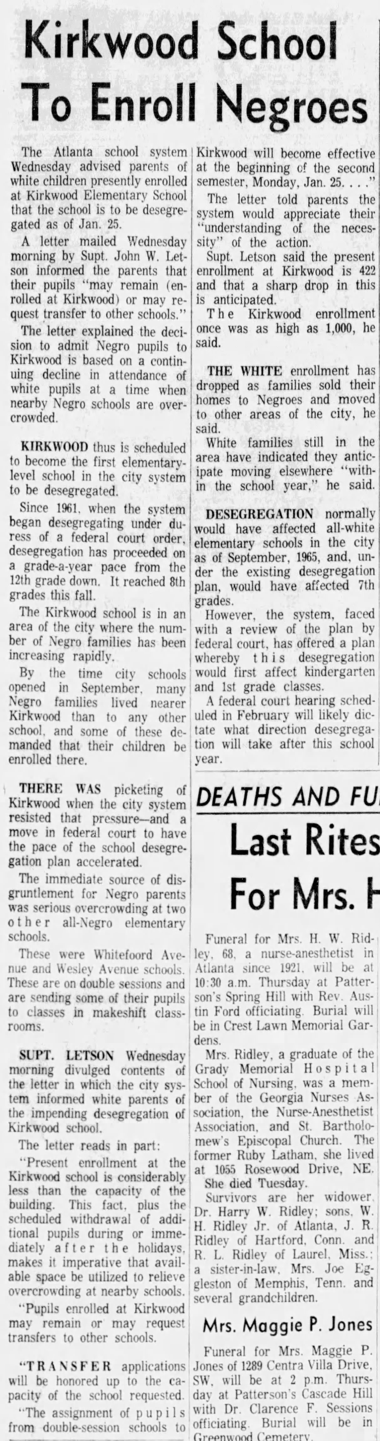 The Atlanta Constitution reported that on Monday, January 25, 1965 approximately 500 black children were enrolled at Kirkwood Elementary, and of the 470 white children enrolled there the previous month only 7 remained. The entire teaching staff left with the white students, and only the white principal remained at the school.
